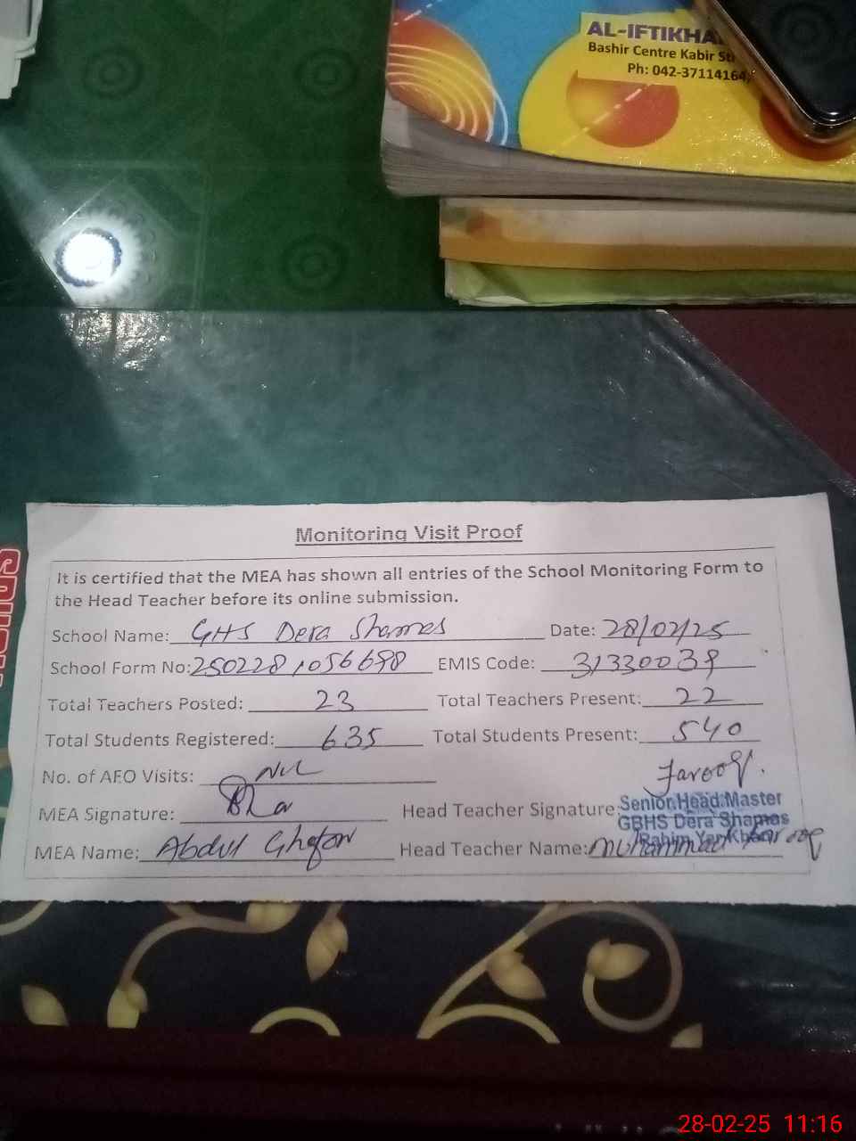 | Attendance Register | Head Teacher | MEA with School | Visit Proof |