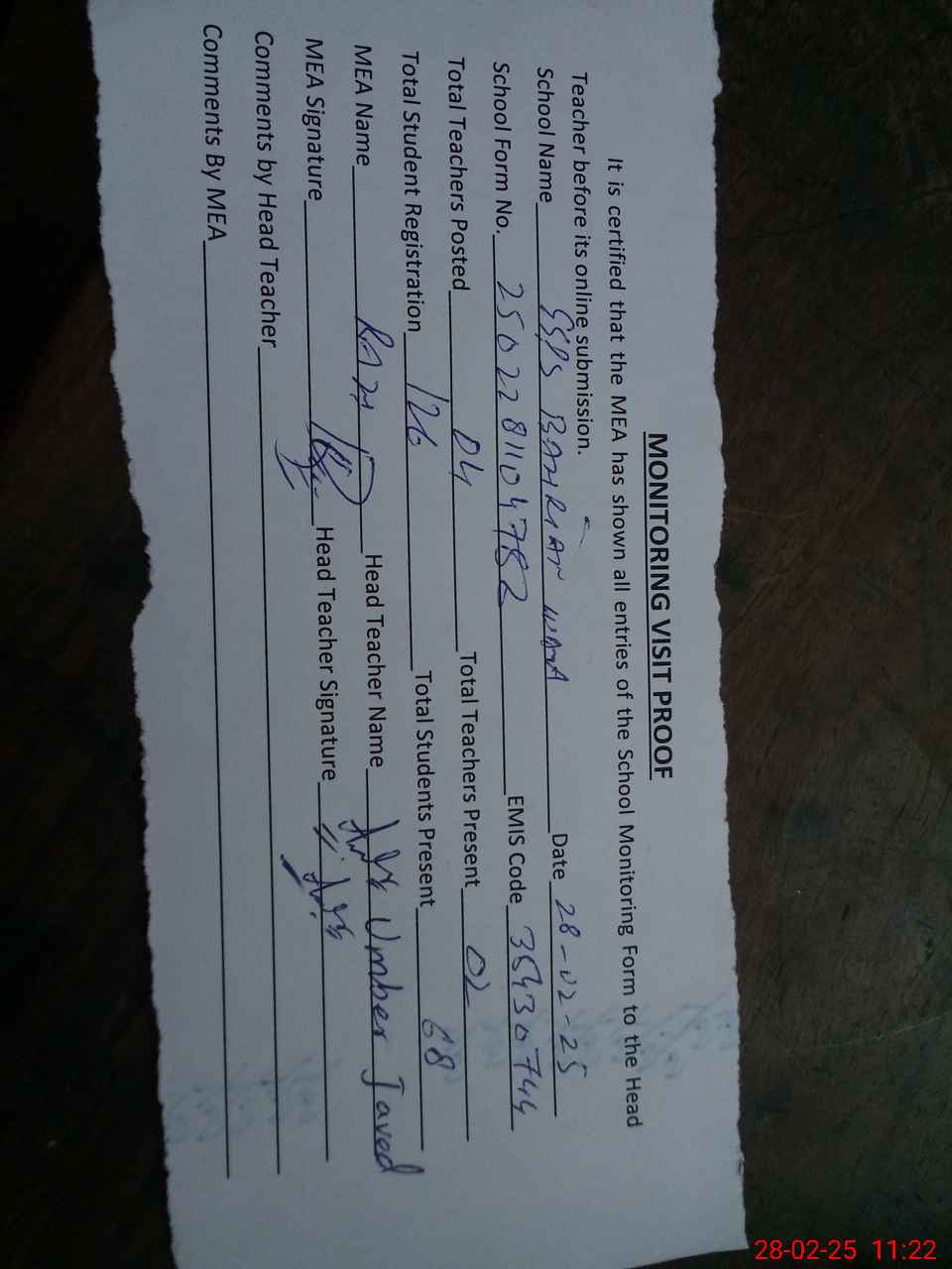 | Attendance Register | Head Teacher | MEA with School | Visit Proof |