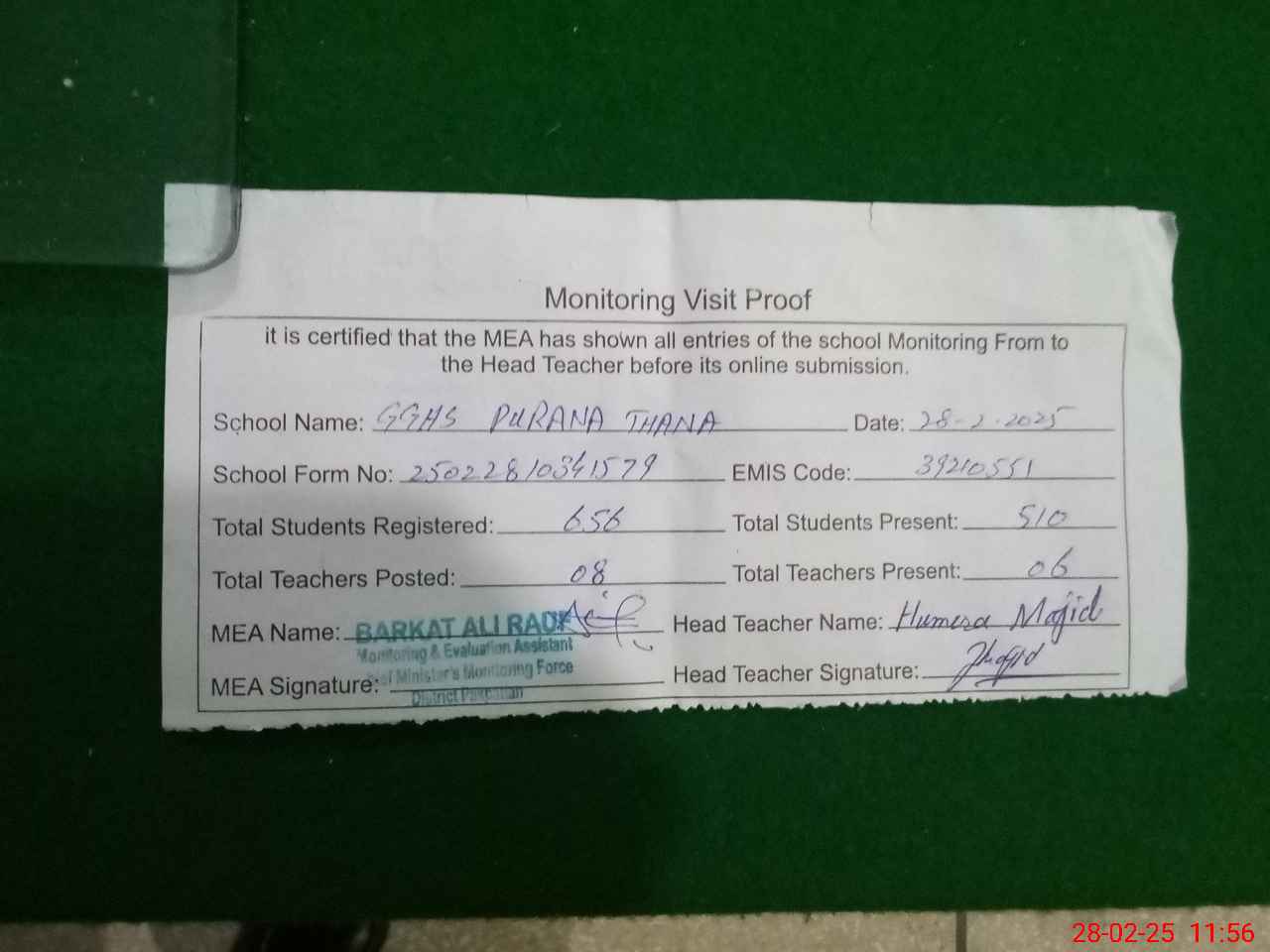 | Attendance Register | Head Teacher | MEA with School | Visit Proof |
