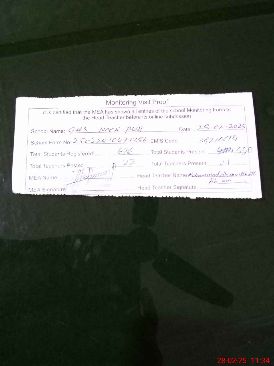 | Attendance Register | Head Teacher | MEA with School | Visit Proof |