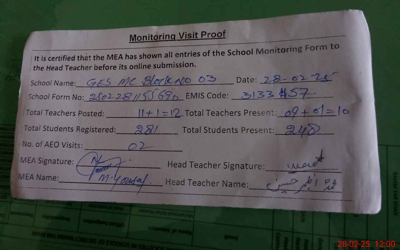 | Attendance Register | Head Teacher | MEA with School | Visit Proof |