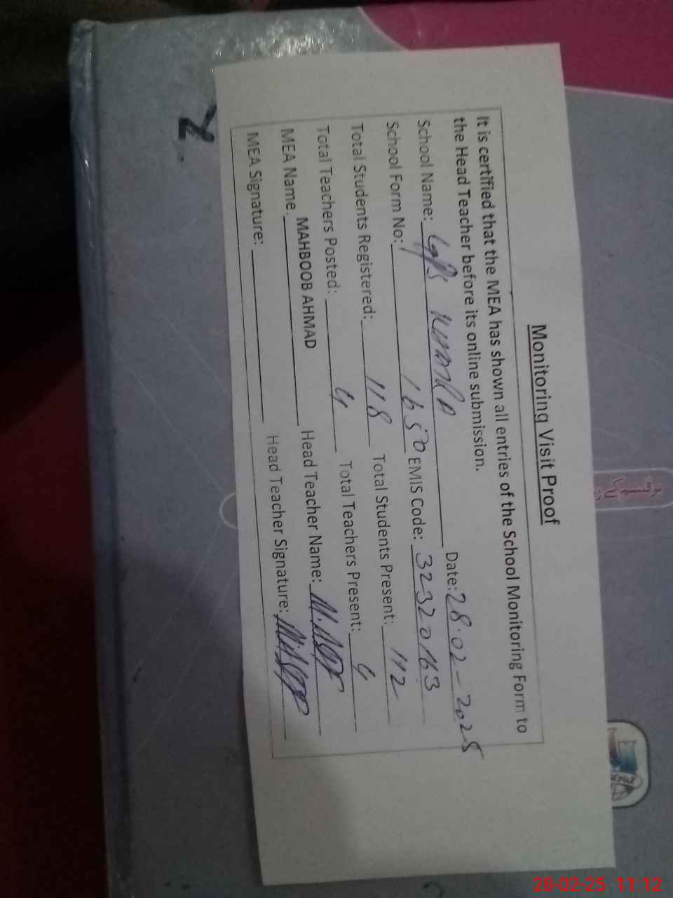 | Attendance Register | Head Teacher | MEA with School | Visit Proof |