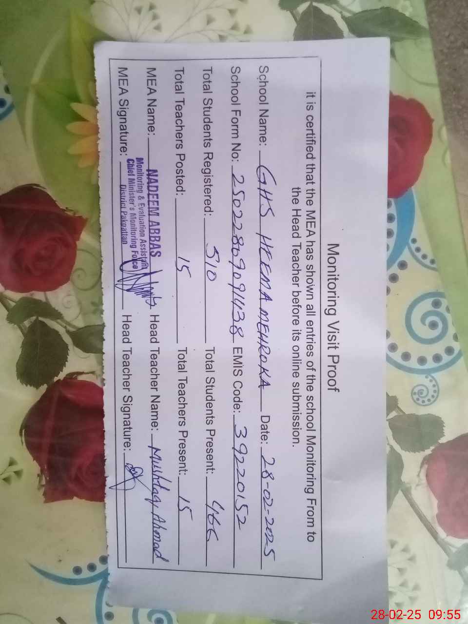| EMIS Code: 39220152 | Name of School: GHS HEEMA MEHROKA | |||