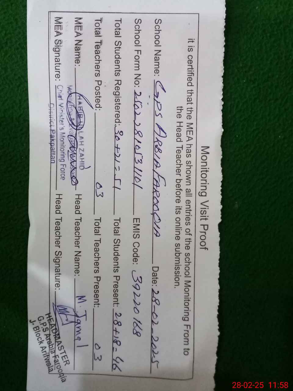 | EMIS Code: 39220168 | Name of School: GPS ARABIA FAROOQIA ARIFWALA J BLOCK | |||