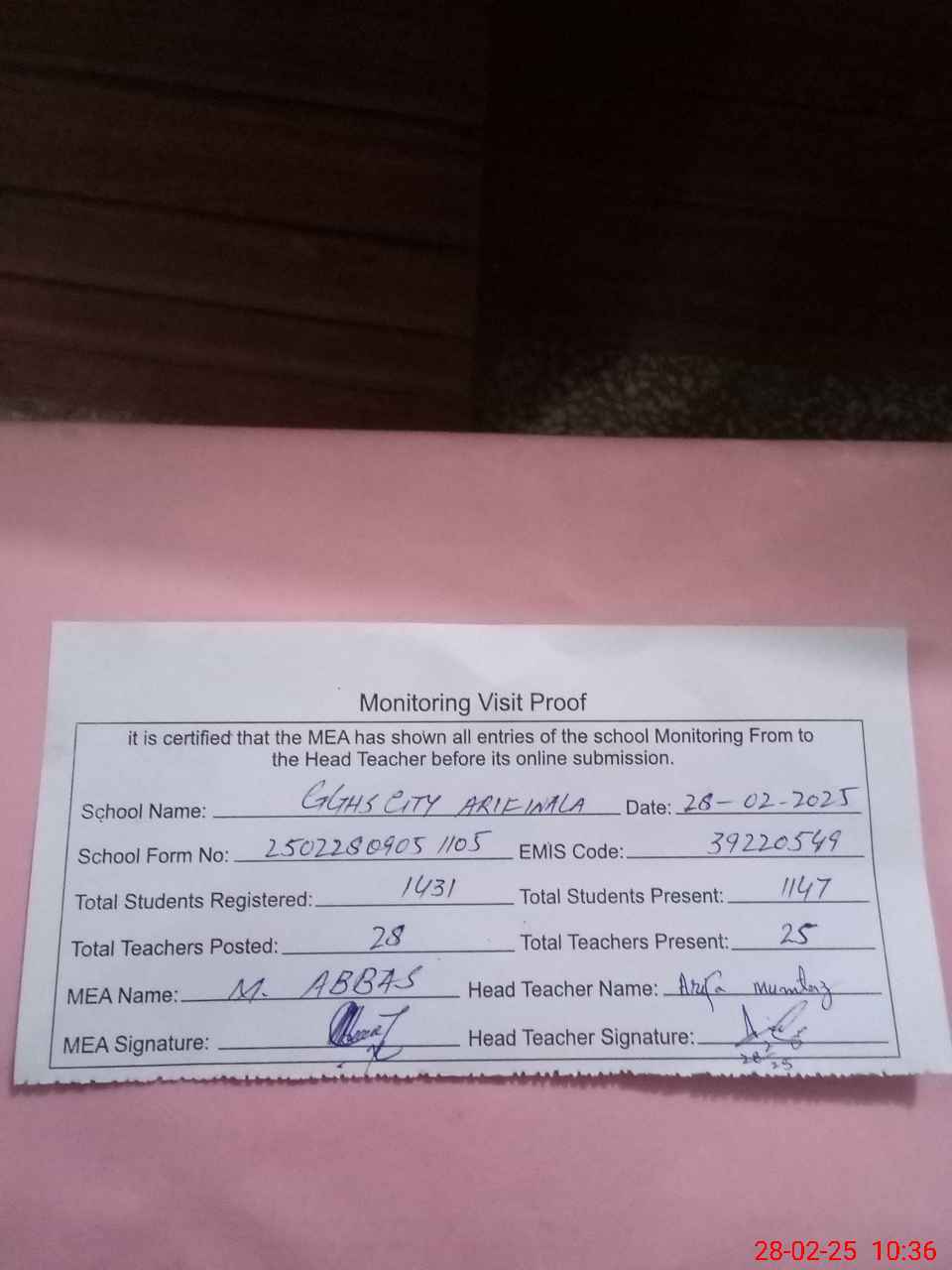 | Attendance Register | Head Teacher | MEA with School | Visit Proof |