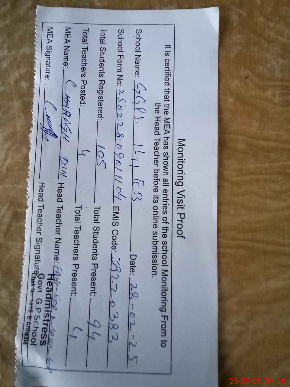 | Attendance Register | Head Teacher | MEA with School | Visit Proof |