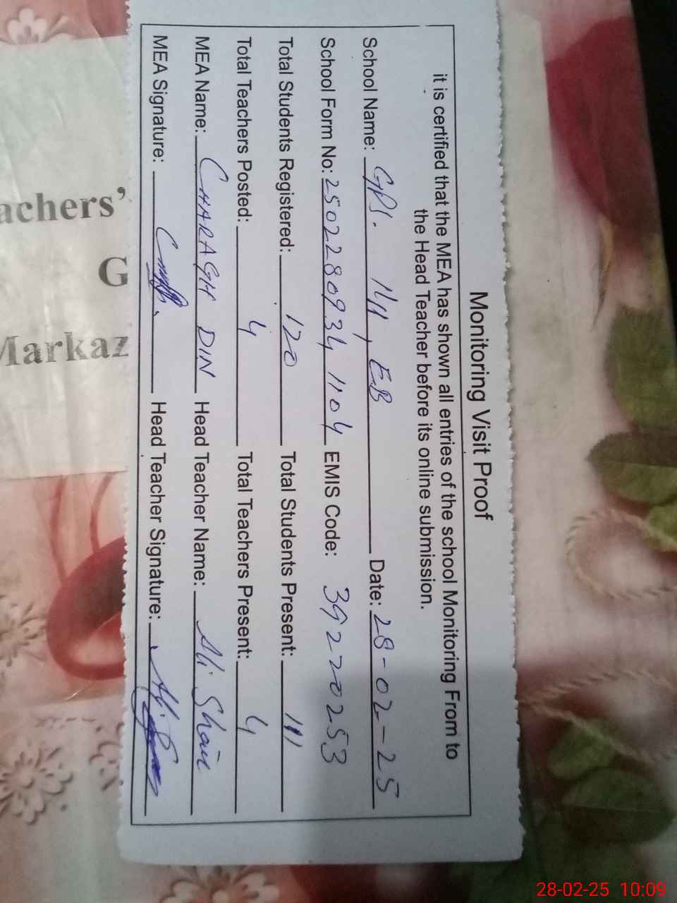| Certified that this School was Inspected by the Undersigned MEA/DMO Today and the Information Stated Above is as Per Record. | |||||