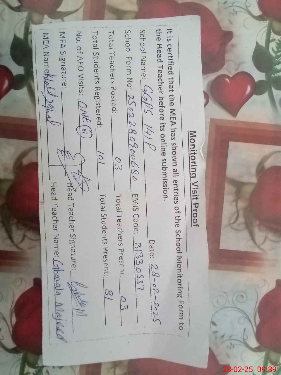 | Attendance Register | Head Teacher | MEA with School | Visit Proof |
