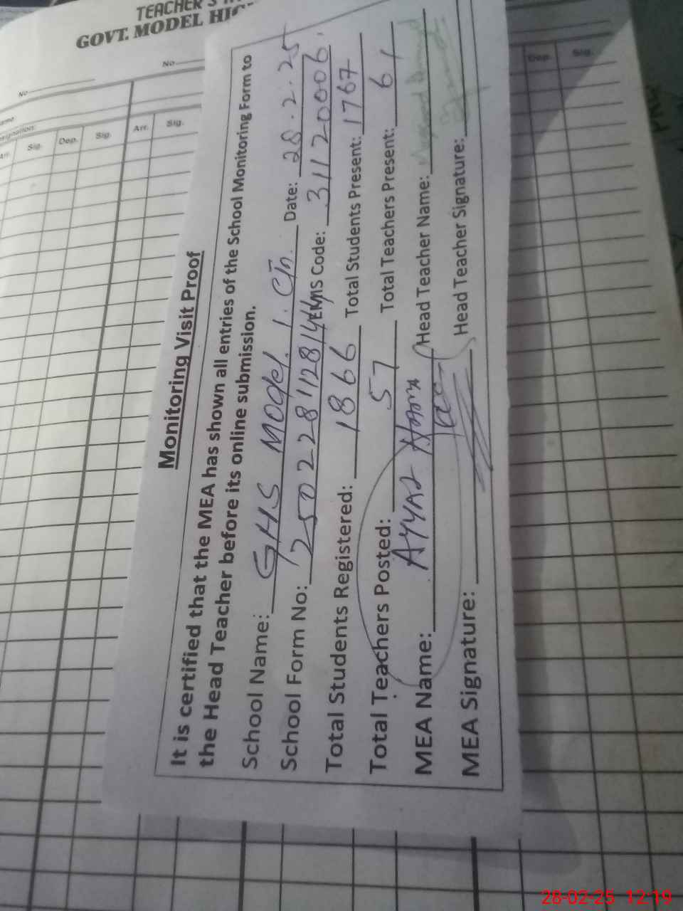 | Attendance Register | Head Teacher | MEA with School | Visit Proof |
