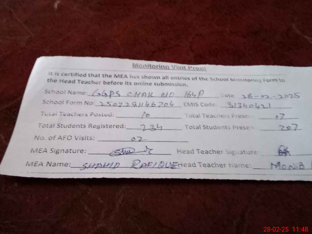 | Certified that this School was Inspected by the Undersigned MEA/DMO Today and the Information Stated Above is as Per Record. | |||||