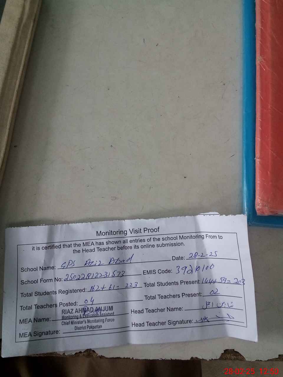| EMIS Code: 39210106 | Name of School: GPS AZIZ ABAD BASTI SWL.ROAD PAKPATTAN | |||