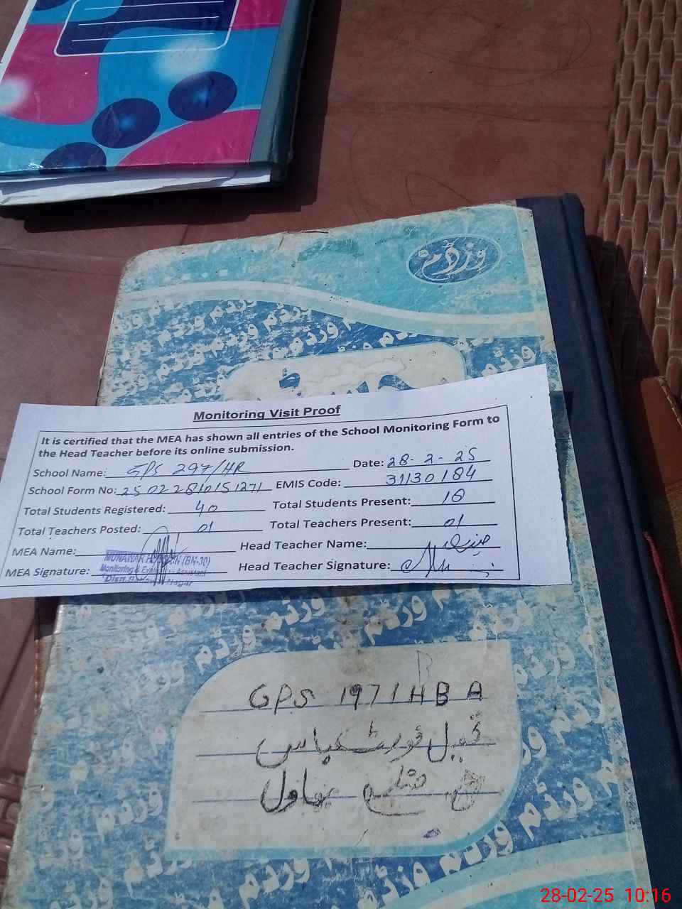 | Attendance Register | Head Teacher | MEA with School | Visit Proof |