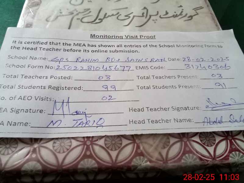 | EMIS Code: 31340306 | Name of School: GPS RAHIM BUX SANSARAIN | |||