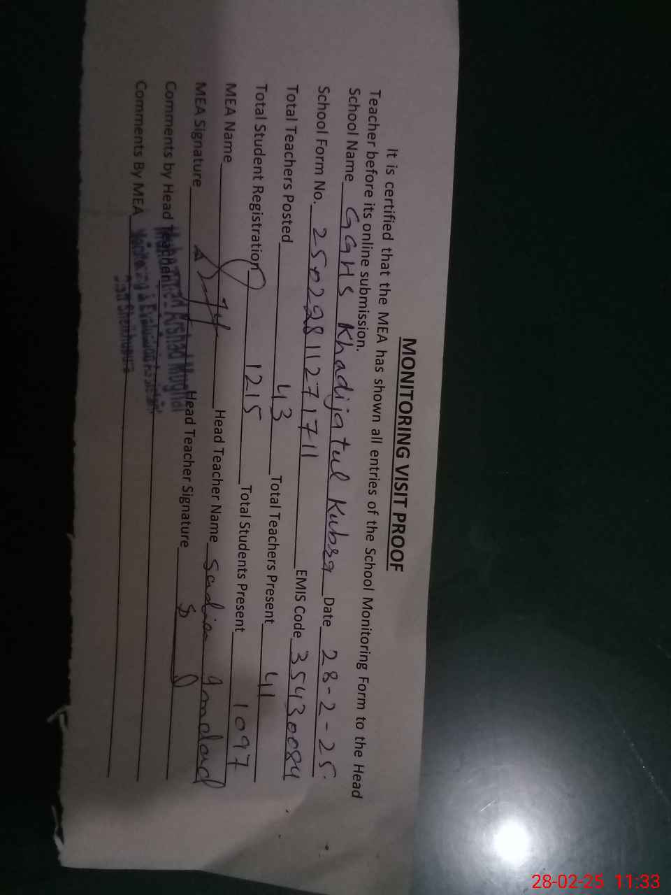 | Attendance Register | Head Teacher | MEA with School | Visit Proof |