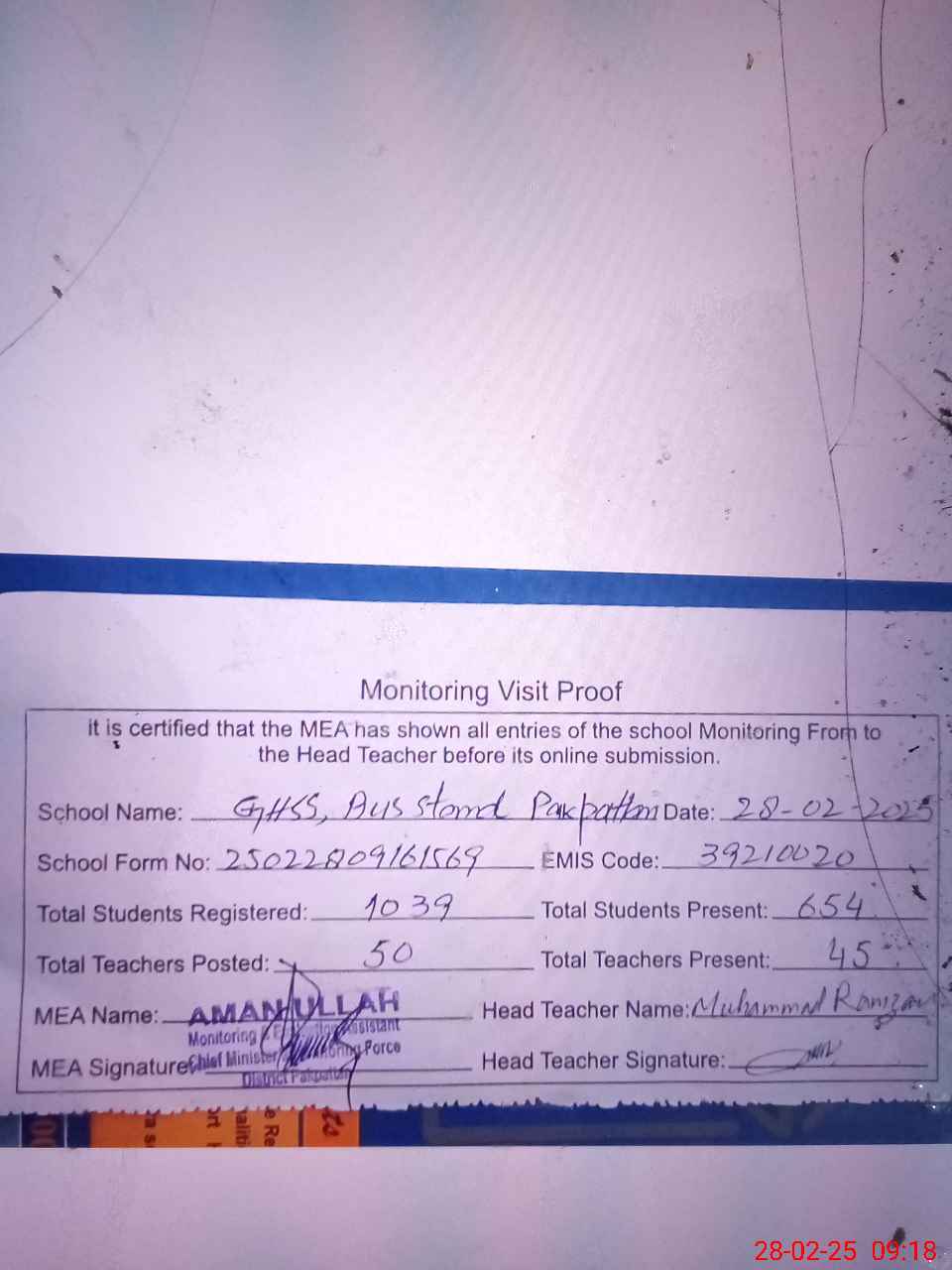 | EMIS Code: 39210020 | Name of School: GHSS BUS STAND PAKPATTAN | |||