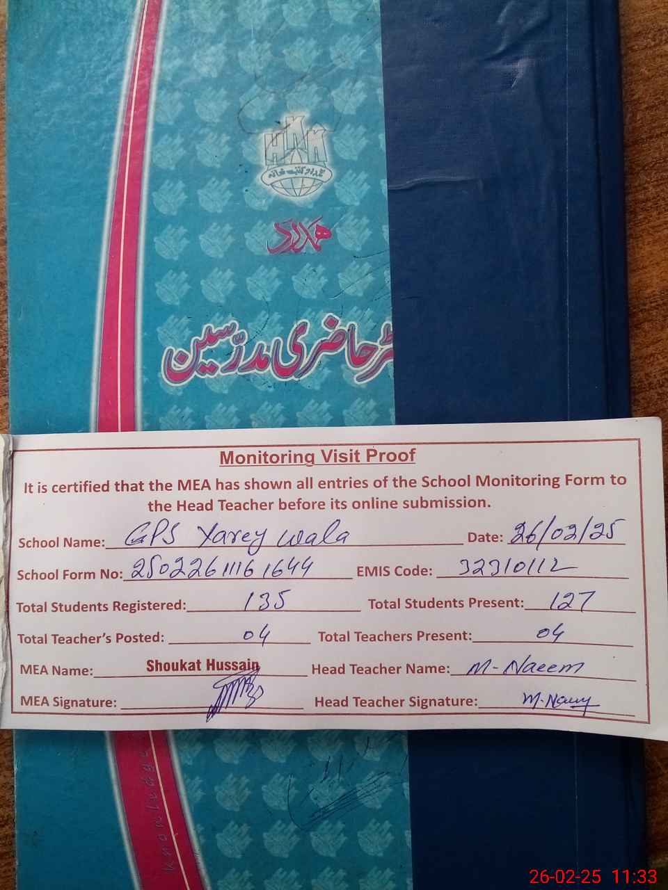 | EMIS Code: 32310112 | Name of School: GPS YARAY WALI | |||
