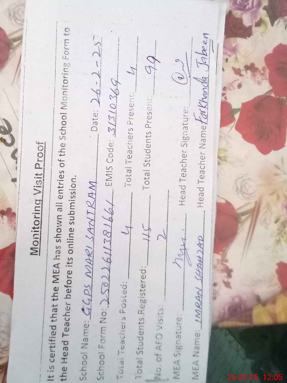 | Attendance Register | Head Teacher | MEA with School | Visit Proof |