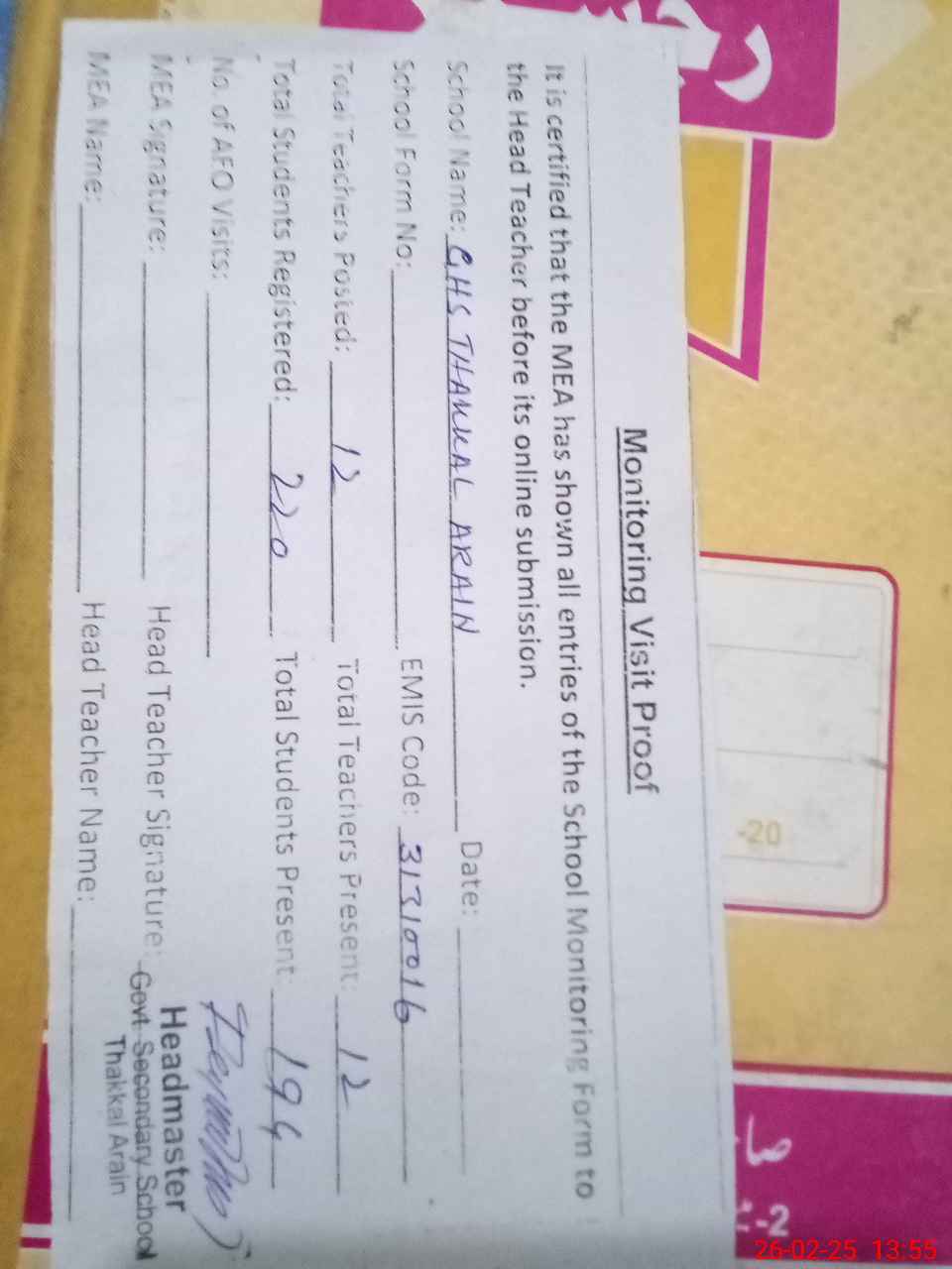 | EMIS Code: 31310016 | Name of School: GHS THAKKAL ARAIN | |||
