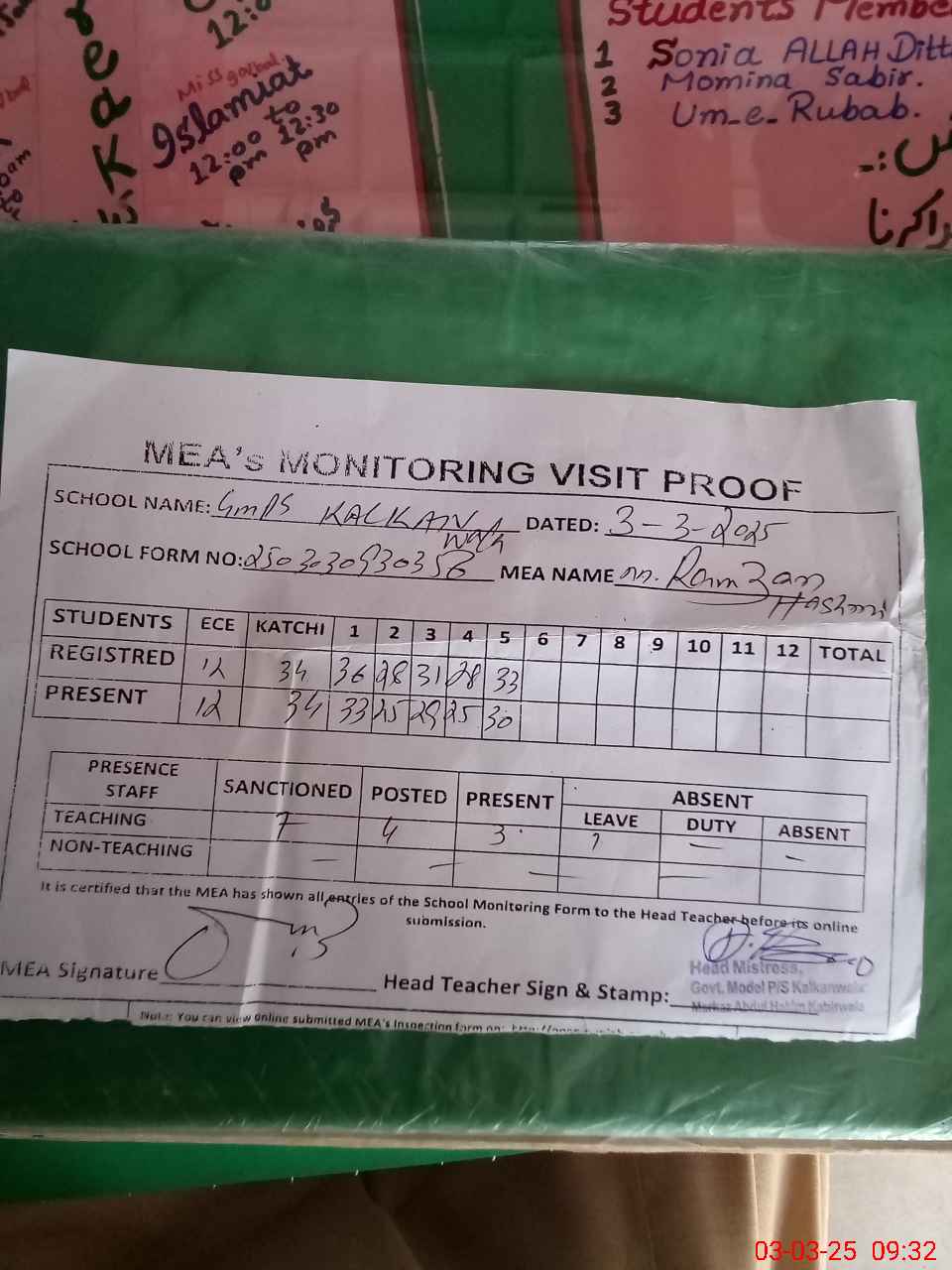 | Attendance Register | Head Teacher | MEA with School | Visit Proof |