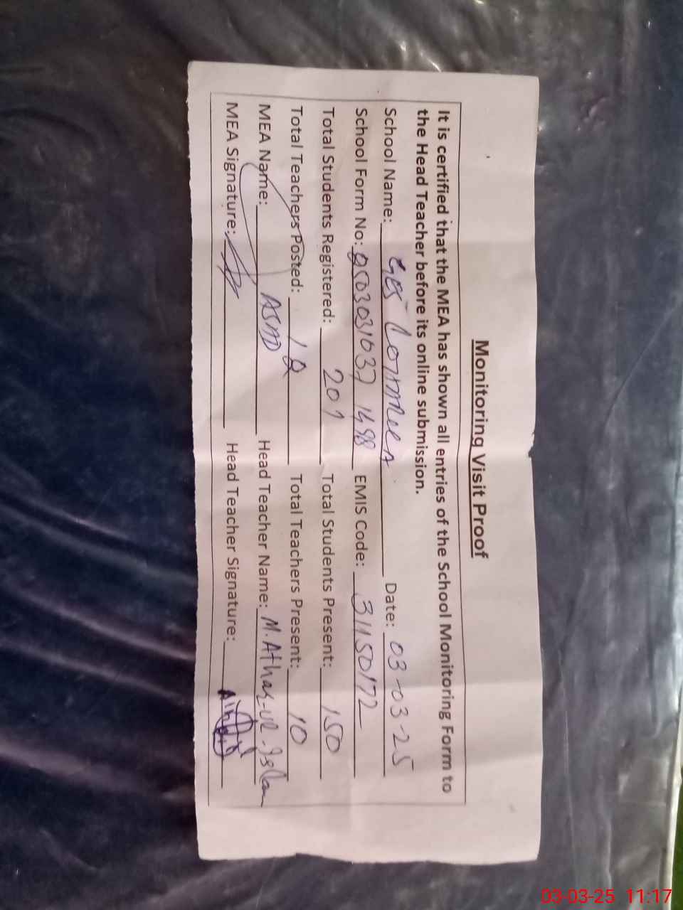 | Attendance Register | Head Teacher | MEA with School | Visit Proof |