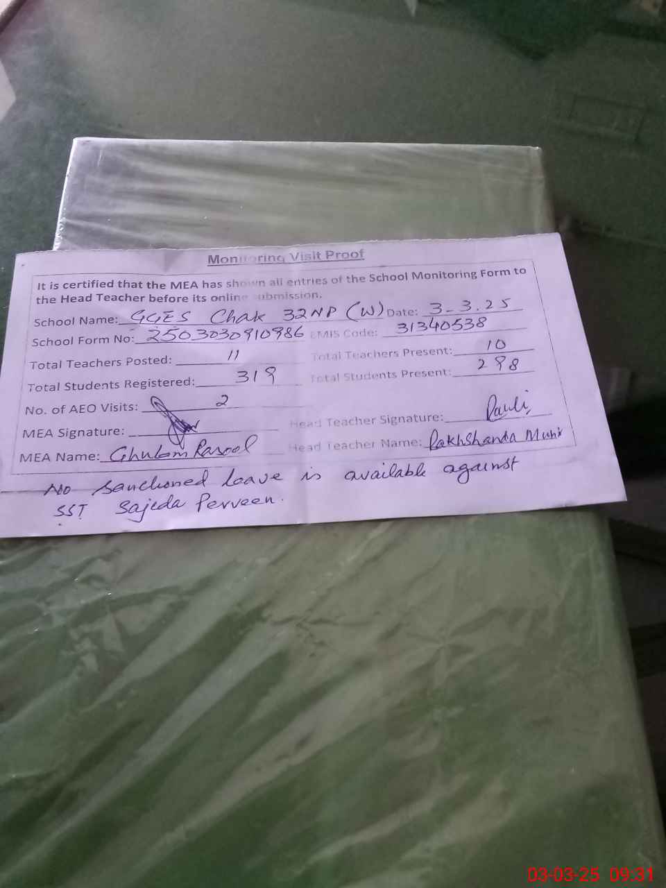 | Remarks (Use Separate Page if Required): No sanctioned leave is shown against the absent teacher name SST Sajida Perveen and she is shown on leave since 1st February | |||||