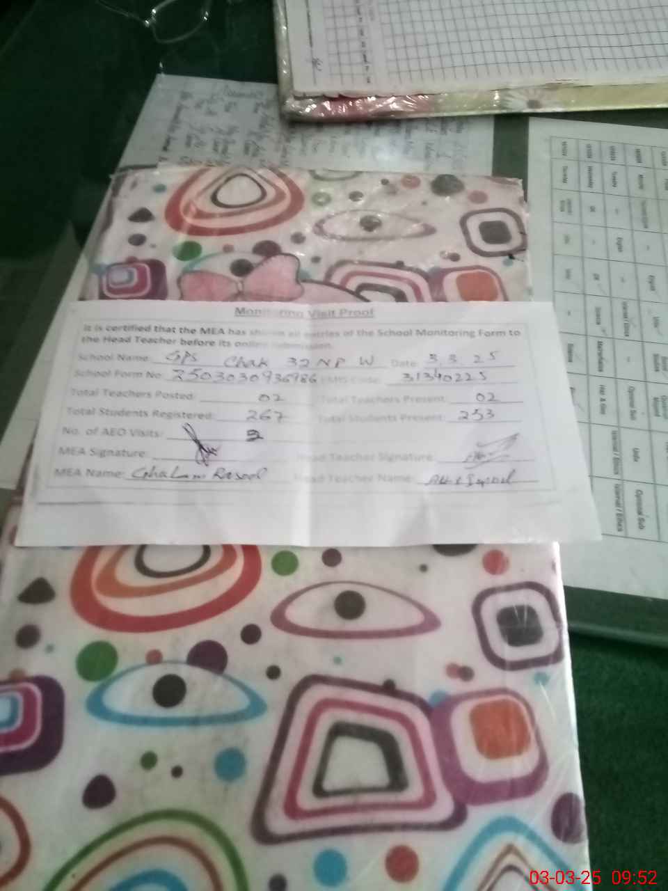 | Attendance Register | Head Teacher | MEA with School | Visit Proof |