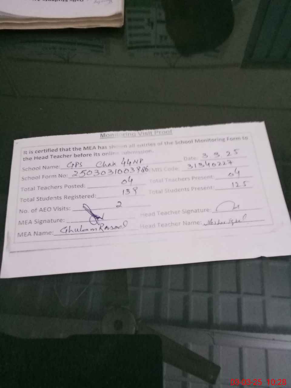 | EMIS Code: 31340227 | Name of School: GPS CHAK NO. 44 NP | |||