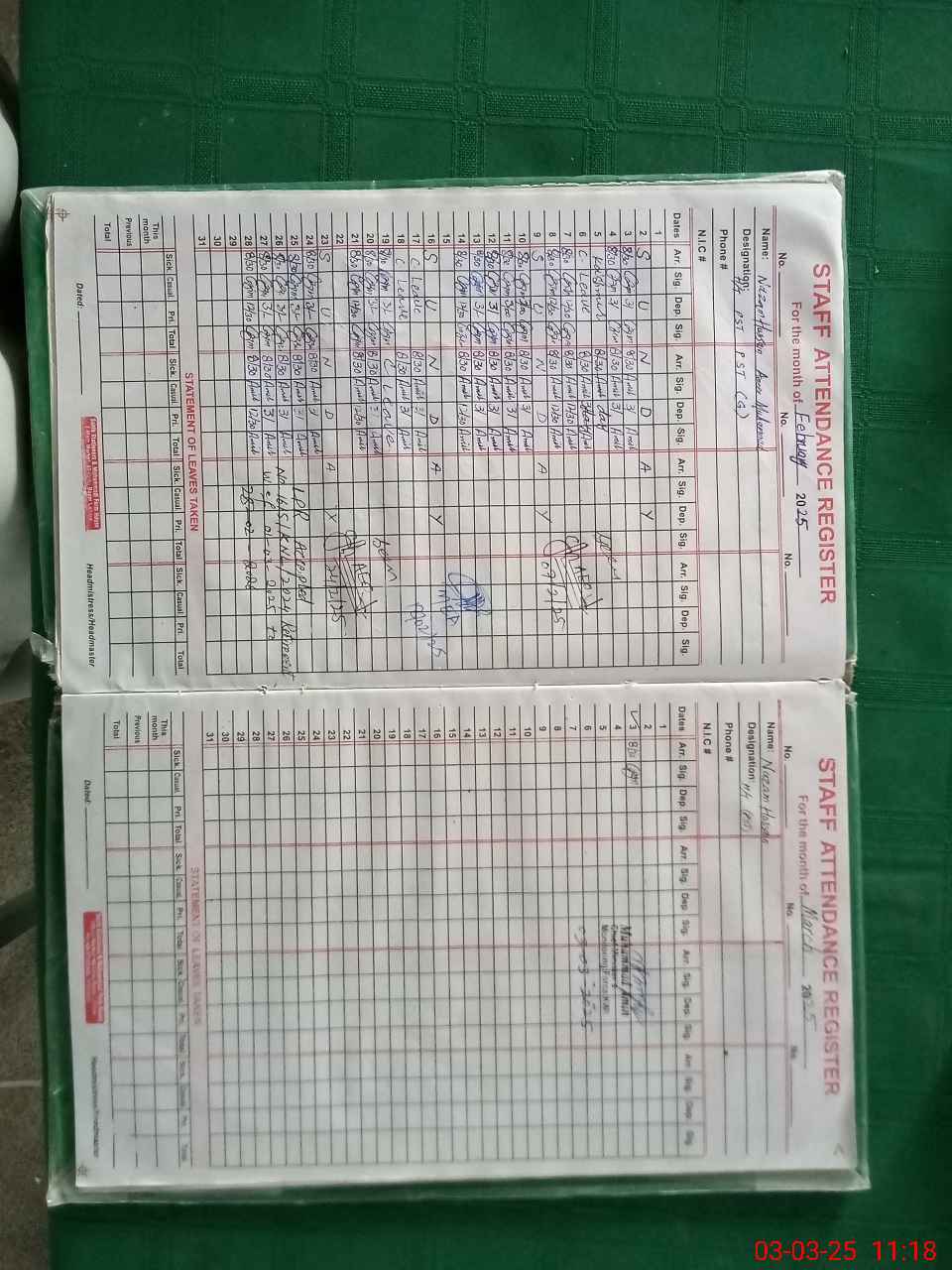 | CNIC | Full Name | Designation | R/C | Absence During Last Calender Month |