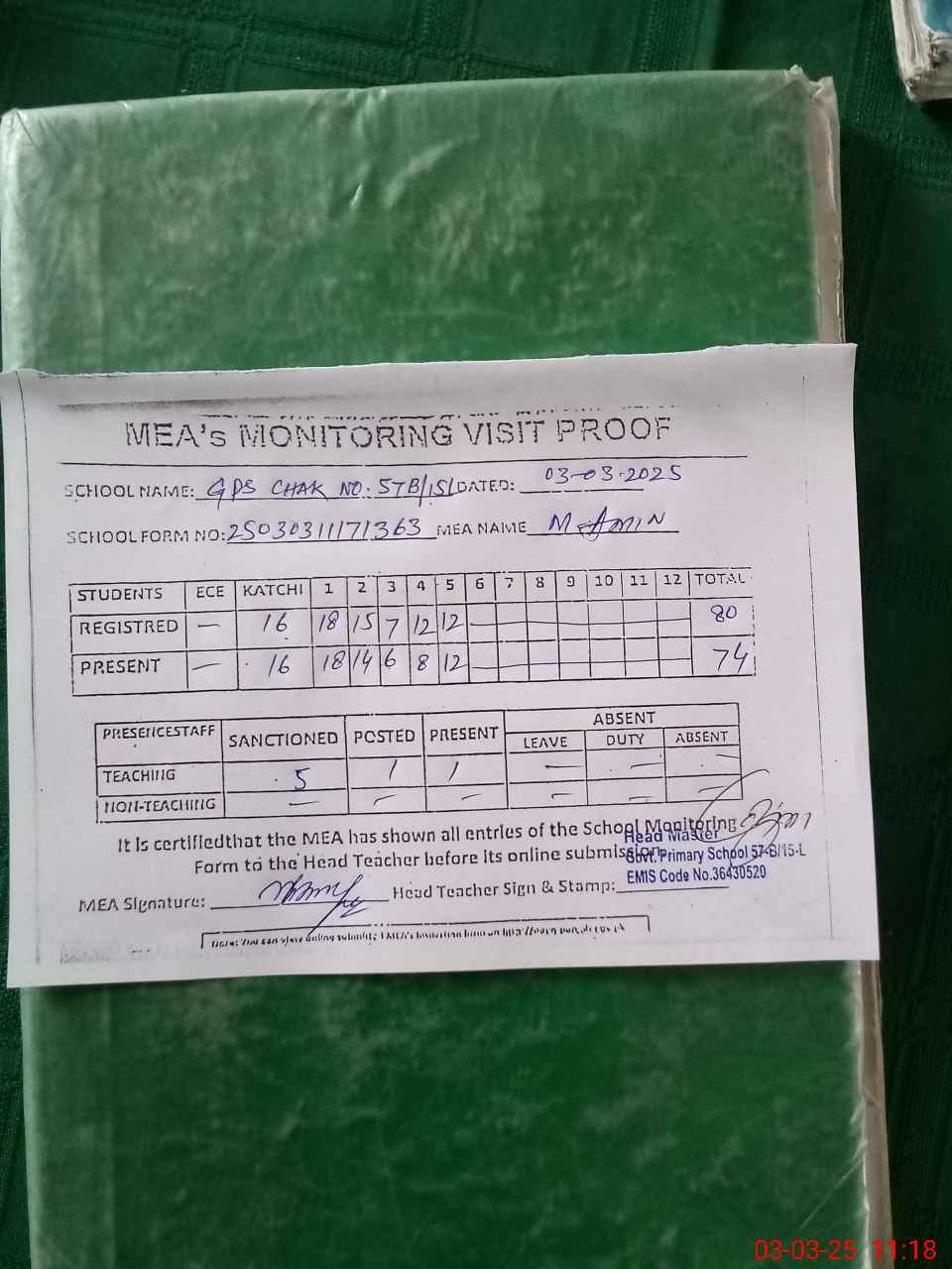 | Attendance Register | Head Teacher | MEA with School | Visit Proof |