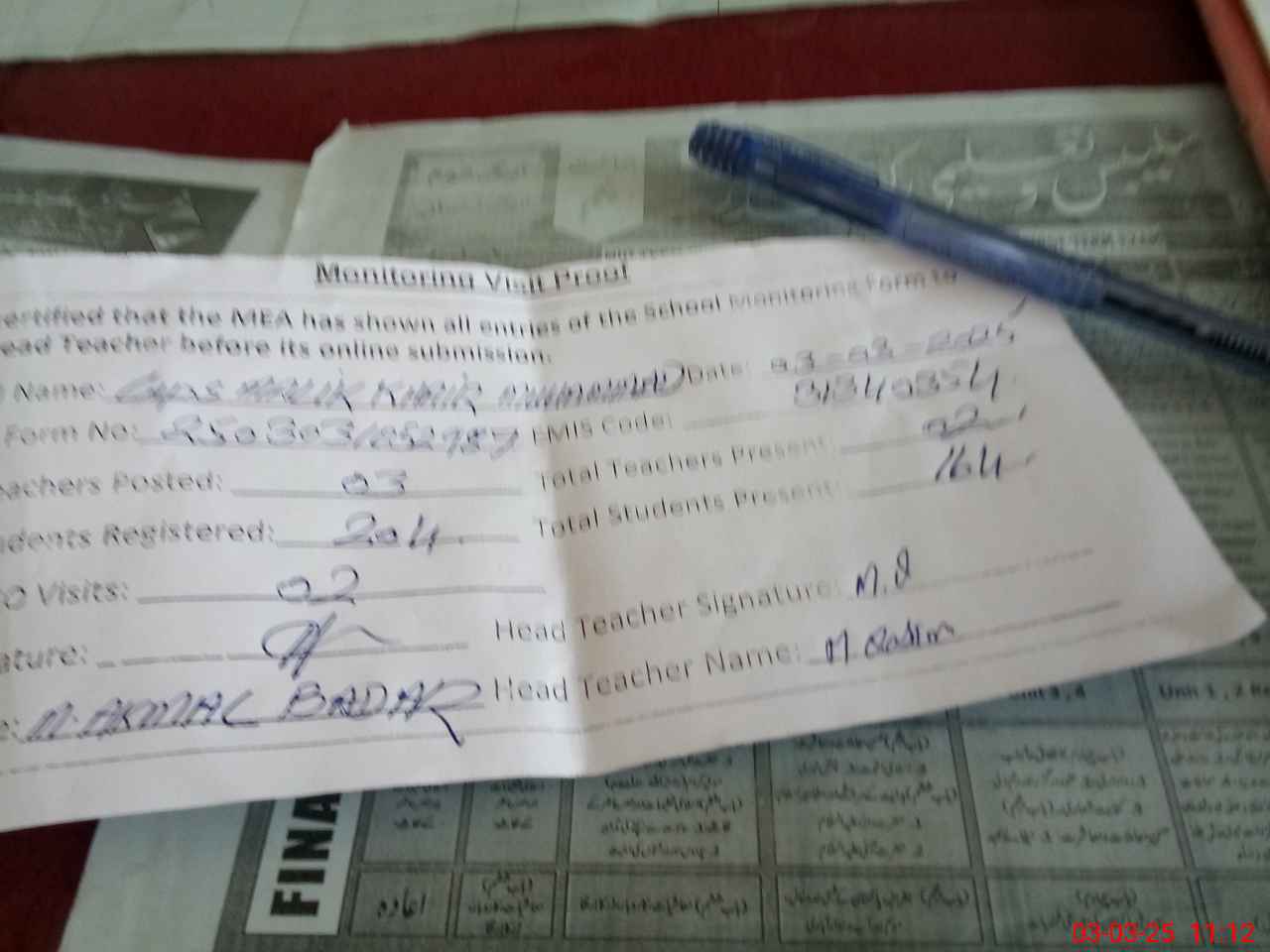 | Attendance Register | Head Teacher | MEA with School | Visit Proof |