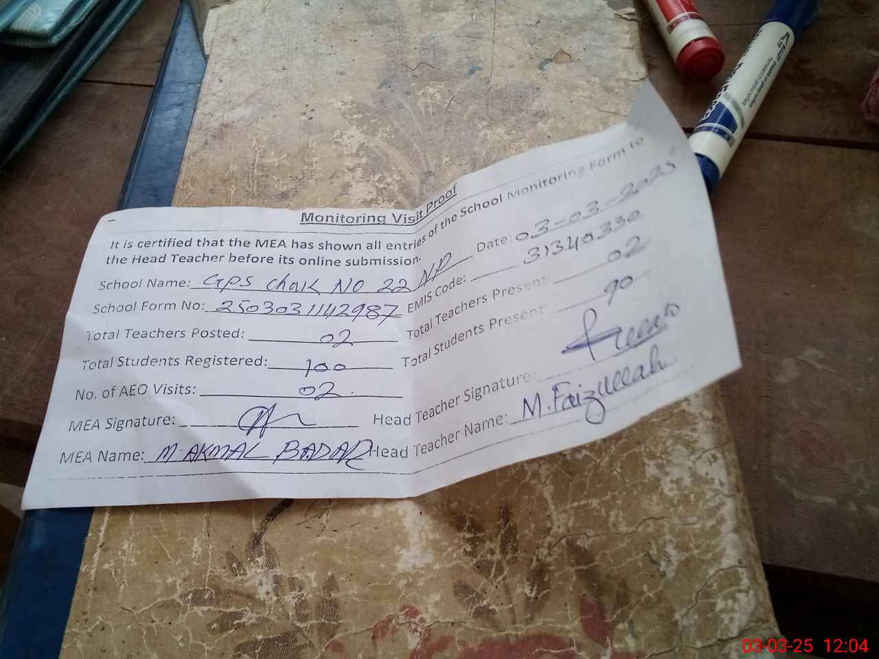 | EMIS Code: 31340330 | Name of School: GPS CHAK NO 22/NP | |||