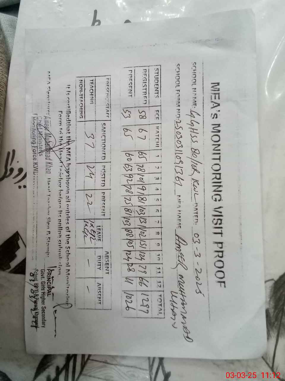 | Attendance Register | Head Teacher | MEA with School | Visit Proof |