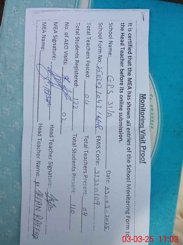 | EMIS Code: 31320109 | Name of School: GPS CHAK 31 A | |||