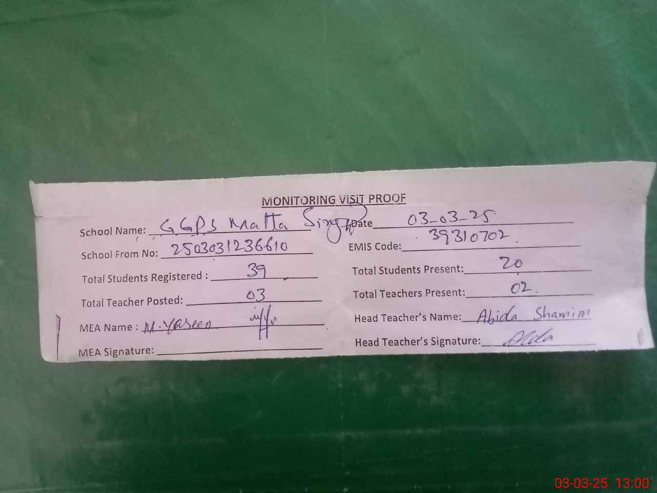 | Attendance Register | Head Teacher | MEA with School | Visit Proof |