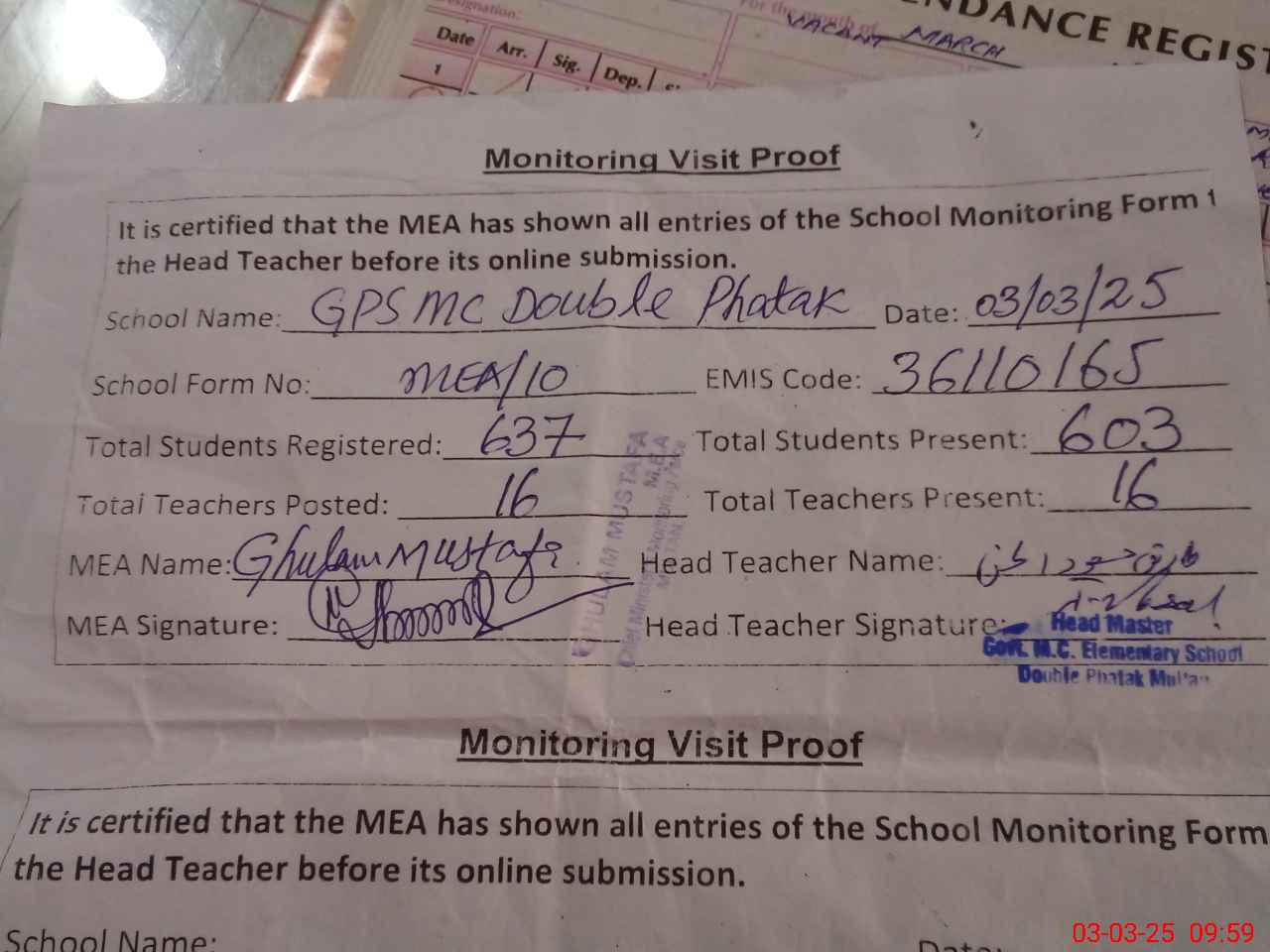 | Attendance Register | Head Teacher | MEA with School | Visit Proof |