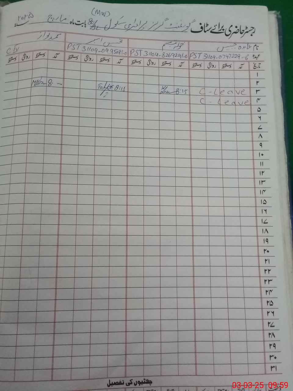 | CNIC | Full Name | Designation | R/C | Absence During Last Calender Month |