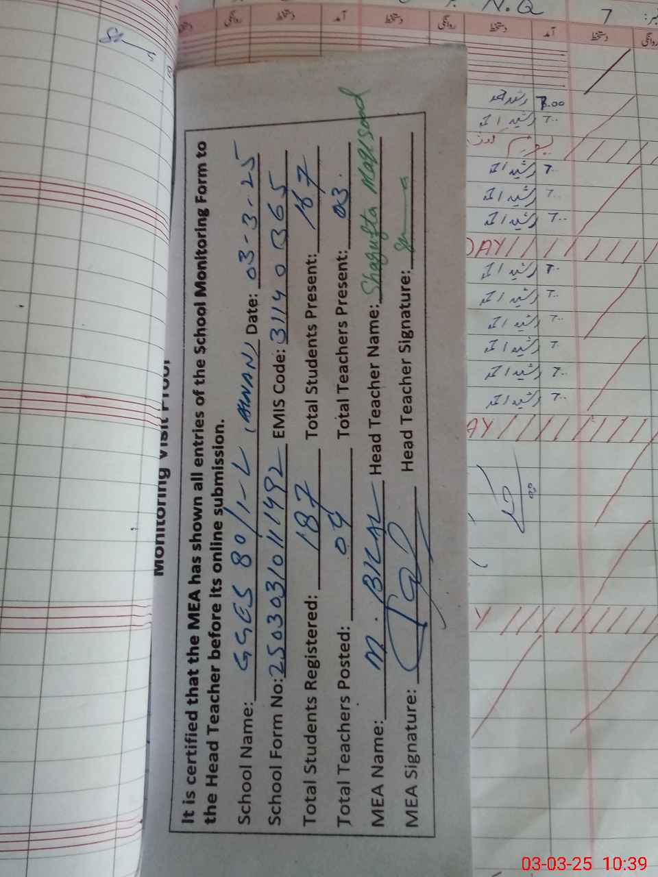 | Attendance Register | Head Teacher | MEA with School | Visit Proof |