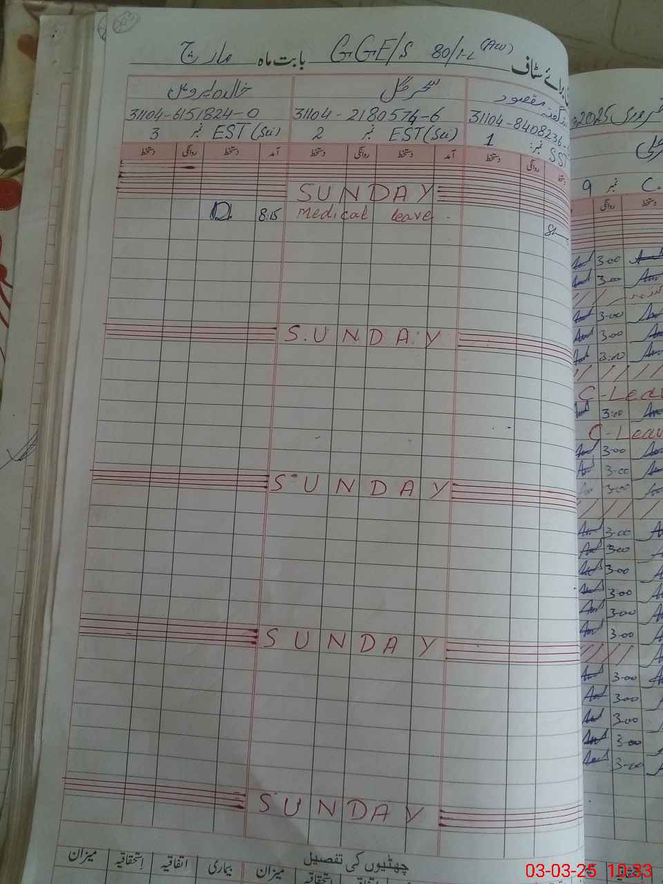 | Leave | Duty | Absent | Maternity | Medical | Ex- Pak |