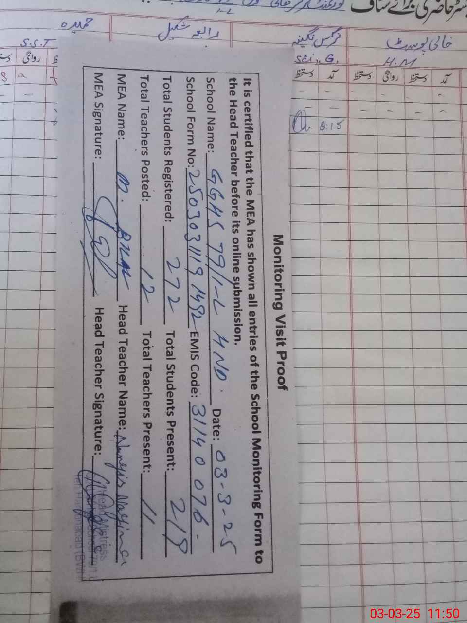| EMIS Code: 31140076 | Name of School: GGHS 79/1-L HAROON ABAD | |||