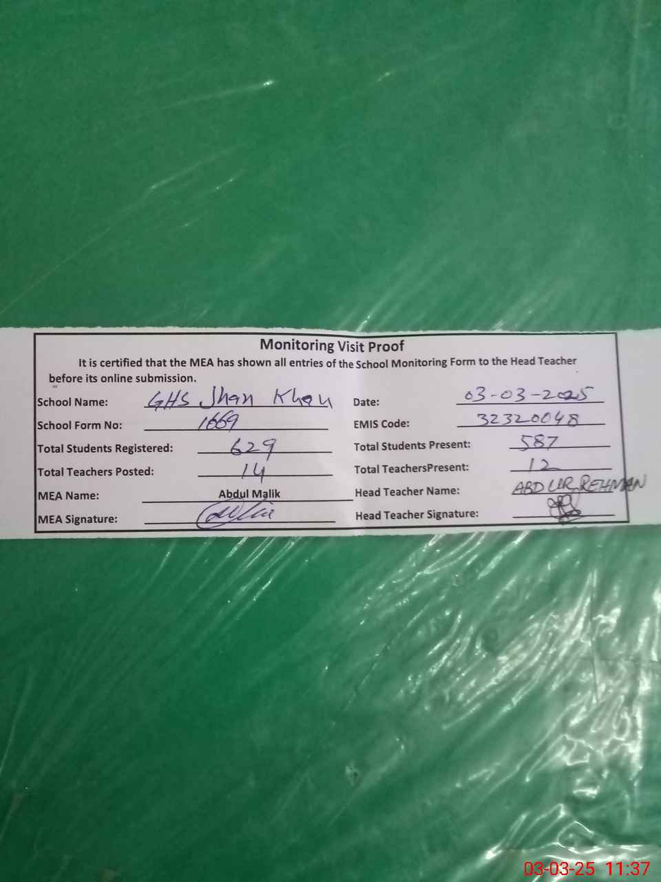 | EMIS Code: 32320048 | Name of School: GHS JAHAN KHAN | |||