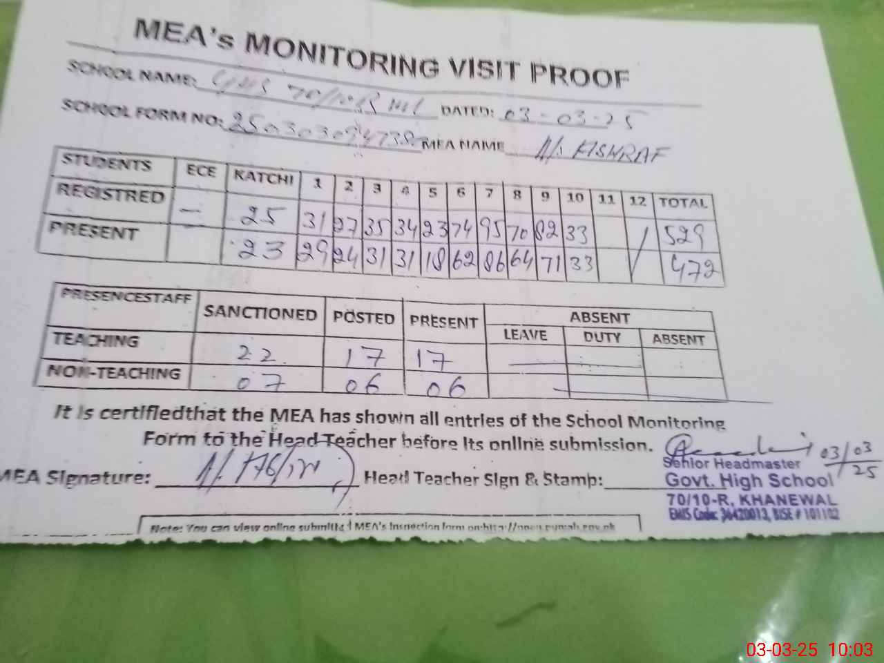 | Attendance Register | Head Teacher | MEA with School | Visit Proof |