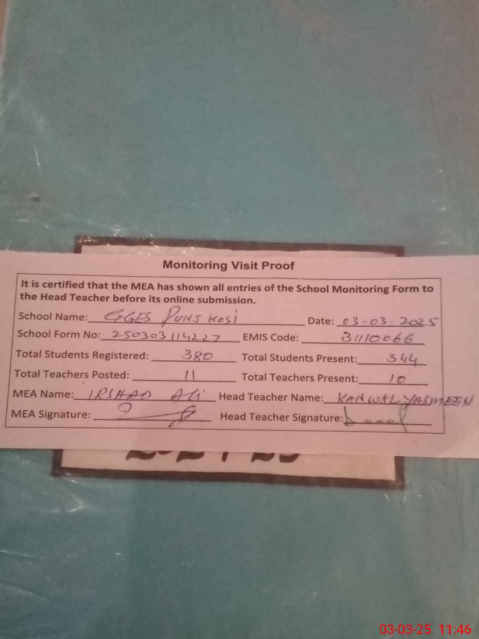 | Attendance Register | Head Teacher | MEA with School | Visit Proof |
