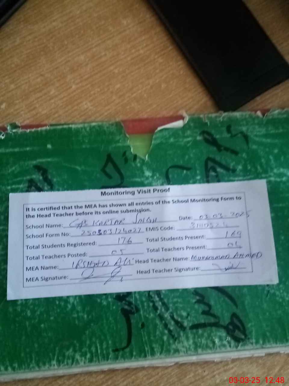 | Attendance Register | Head Teacher | MEA with School | Visit Proof |