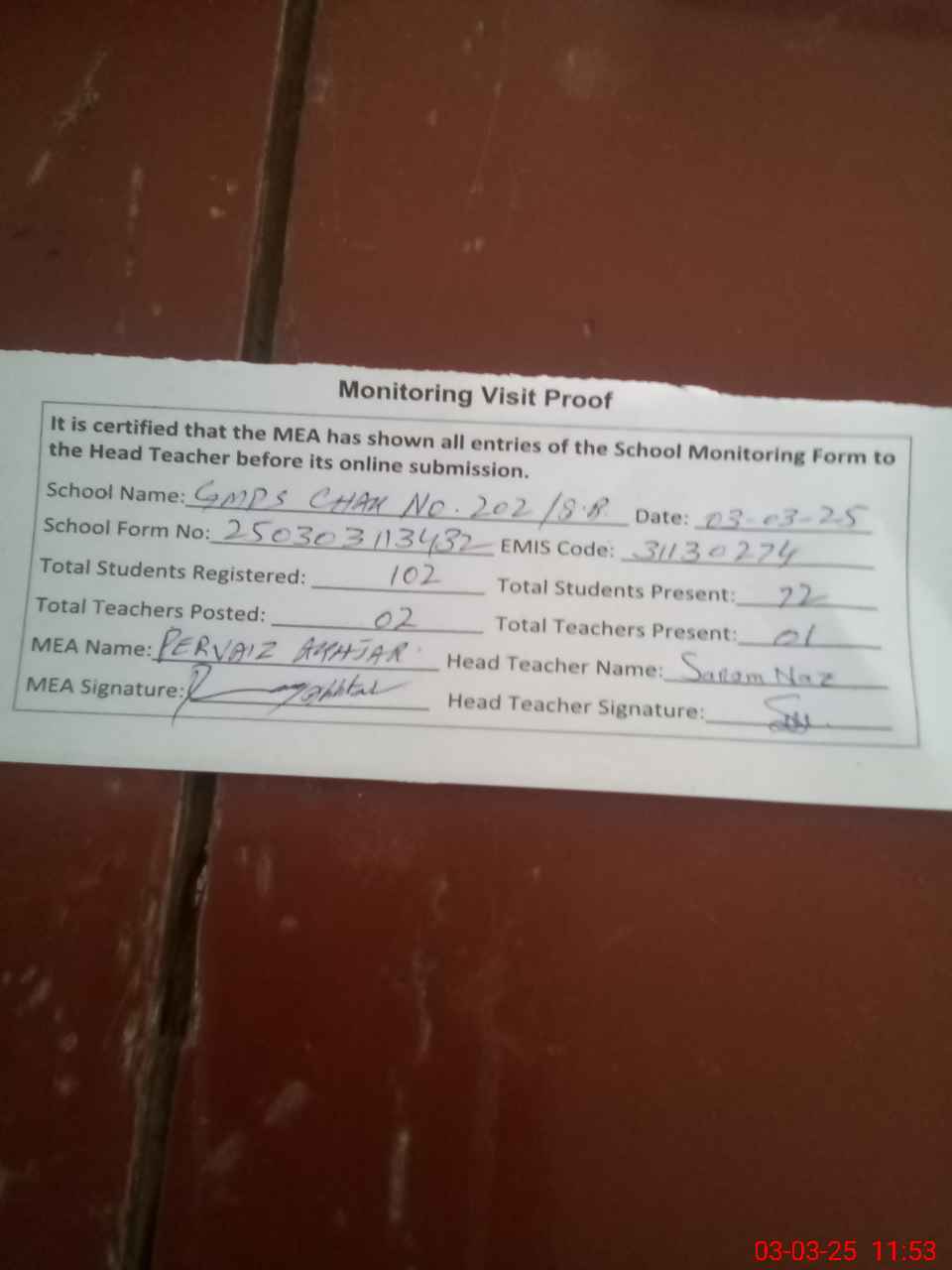 | Attendance Register | Head Teacher | MEA with School | Visit Proof |