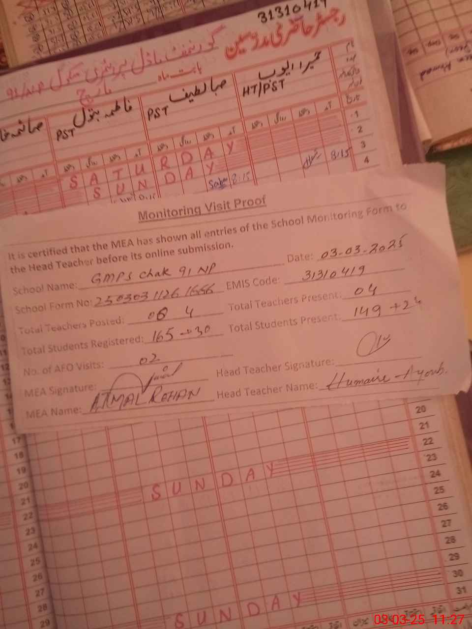 | EMIS Code: 31310419 | Name of School: GMPS CHAK NO 91/NP (After Noon) | |||
