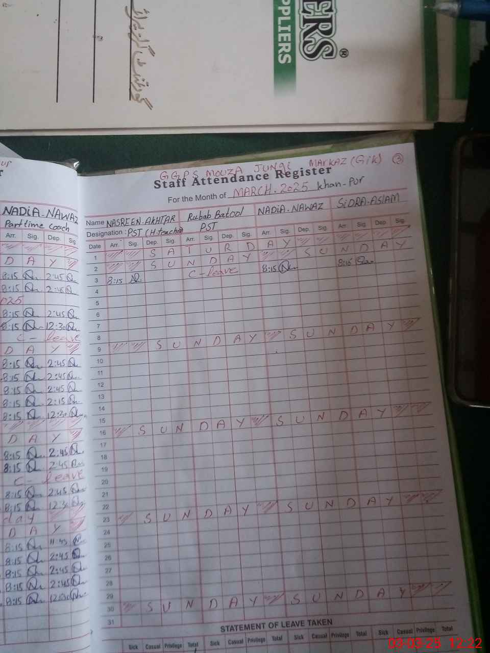 | Leave | Duty | Absent | Maternity | Medical | Ex- Pak |