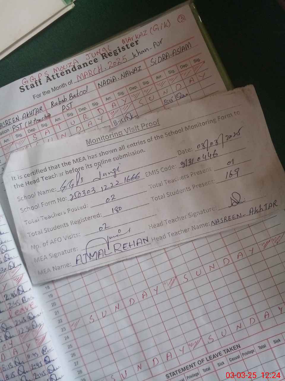 | Attendance Register | Head Teacher | MEA with School | Visit Proof |