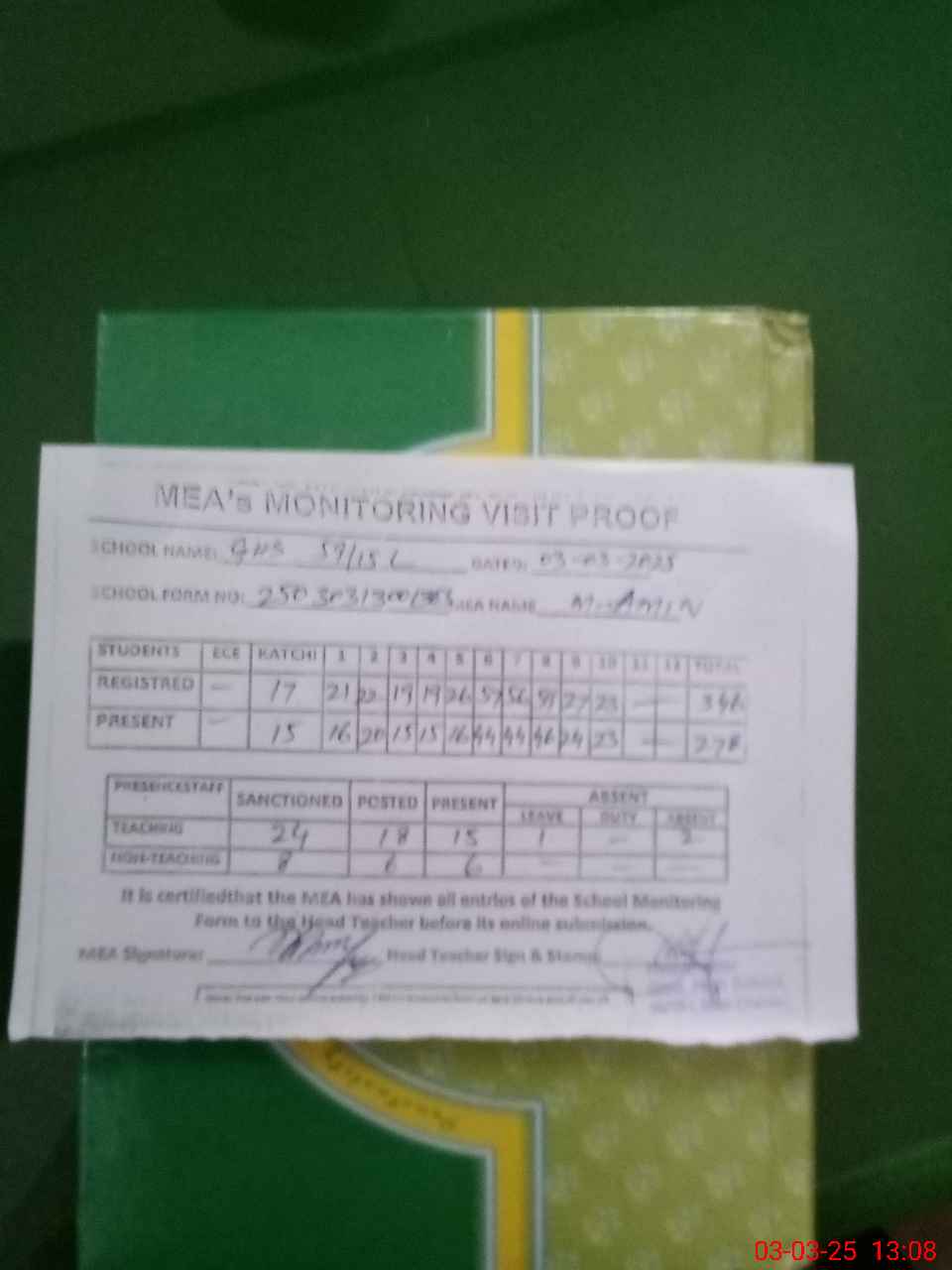 | Attendance Register | Head Teacher | MEA with School | Visit Proof |