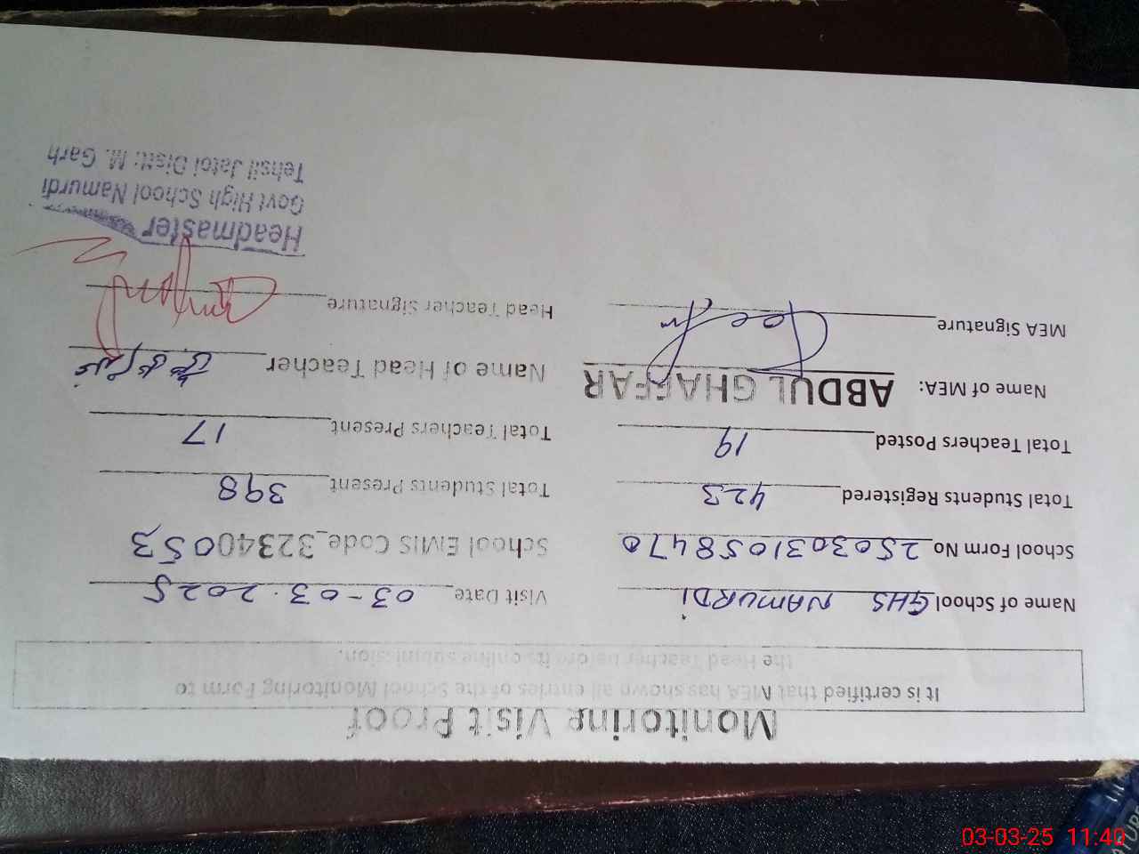 | Certified that this School was Inspected by the Undersigned MEA/DMO Today and the Information Stated Above is as Per Record. | |||||
