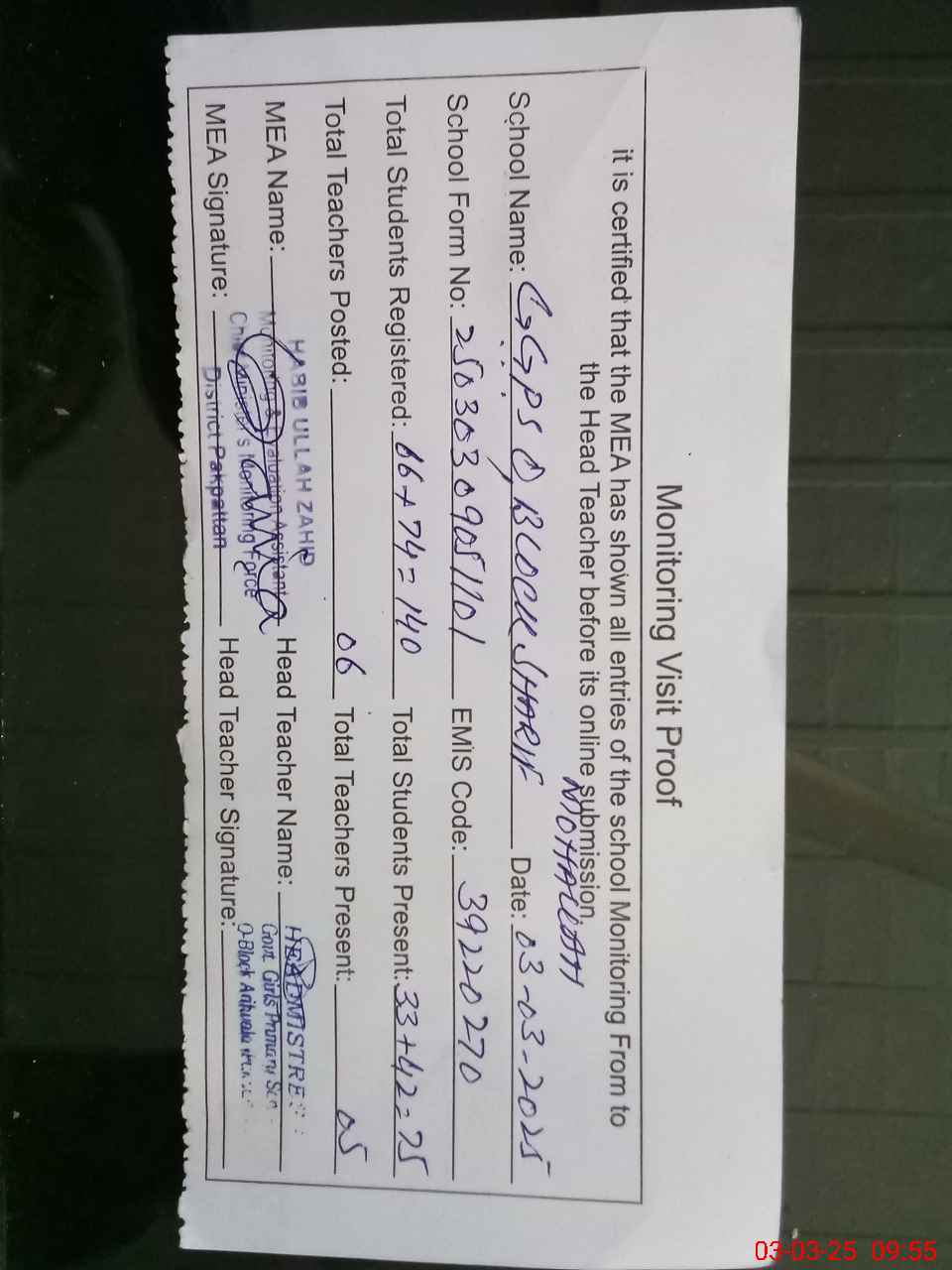 | Attendance Register | Head Teacher | MEA with School | Visit Proof |